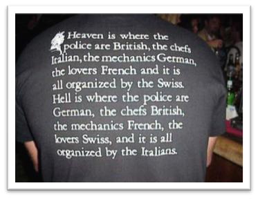 El infierno es donde la policía es alemana, los chefs británicos, los mecánicos franceses, los amantes suizos, y todo ello organizado por los Italianos.»