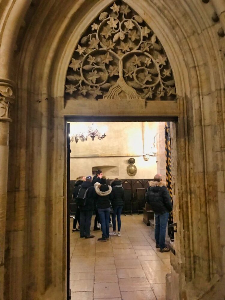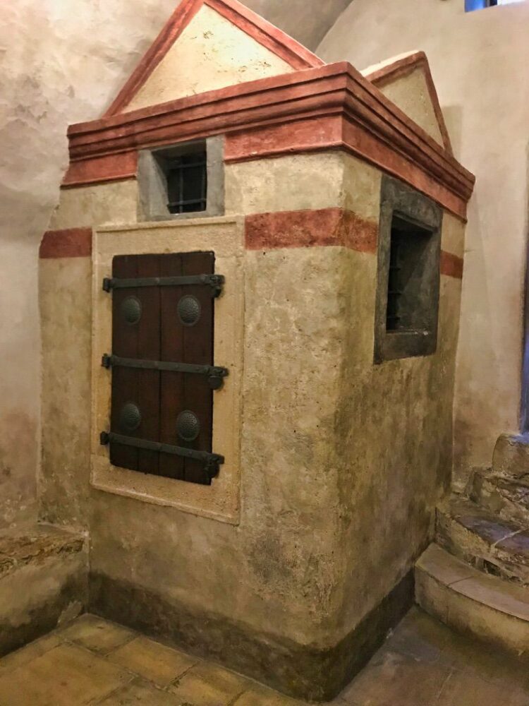 En el siglo XVII, se agregó una tercera nave destinada a las mujeres, quienes podían seguir la liturgia a través de las ventanas que dan a la sala principal, que cuenta con una impresionante bóveda gótica de nervadura de cinco fases.