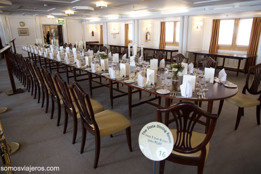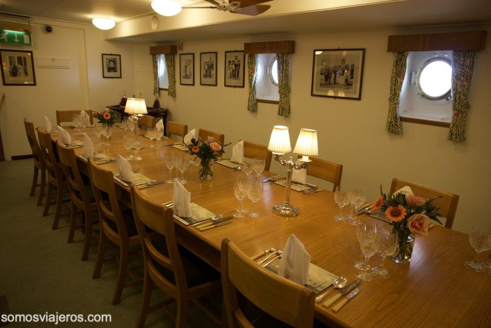 Dado que se realizaban visitas de estado el yate debía estar preparado para grandes comidas de gala. En la sala principal hay una mesa interminable.Cuando la miraba me imaginaba que pasa con la cubertería si hay un mar movidito. Si hubiera podido hubiera buscado un velcro o pegamento debajo del las copas.
